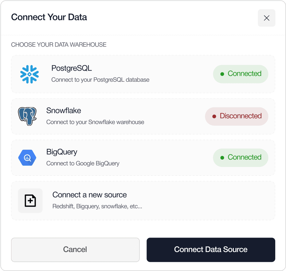 Link your databases, analytics tools, and data sources with our secure connectors