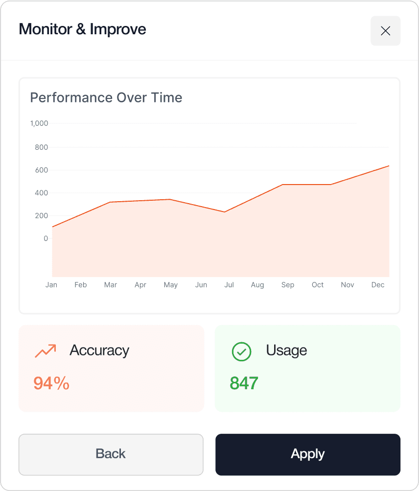 AI can be prone to errors and hallucinations. With Upsolve's intuitive evaluation and testing tools, you can be confident that your agent will respond accurately and helpfully. Our platform allows you to review responses, fine-tune behavior, and continuously improve the agent's performance over time.