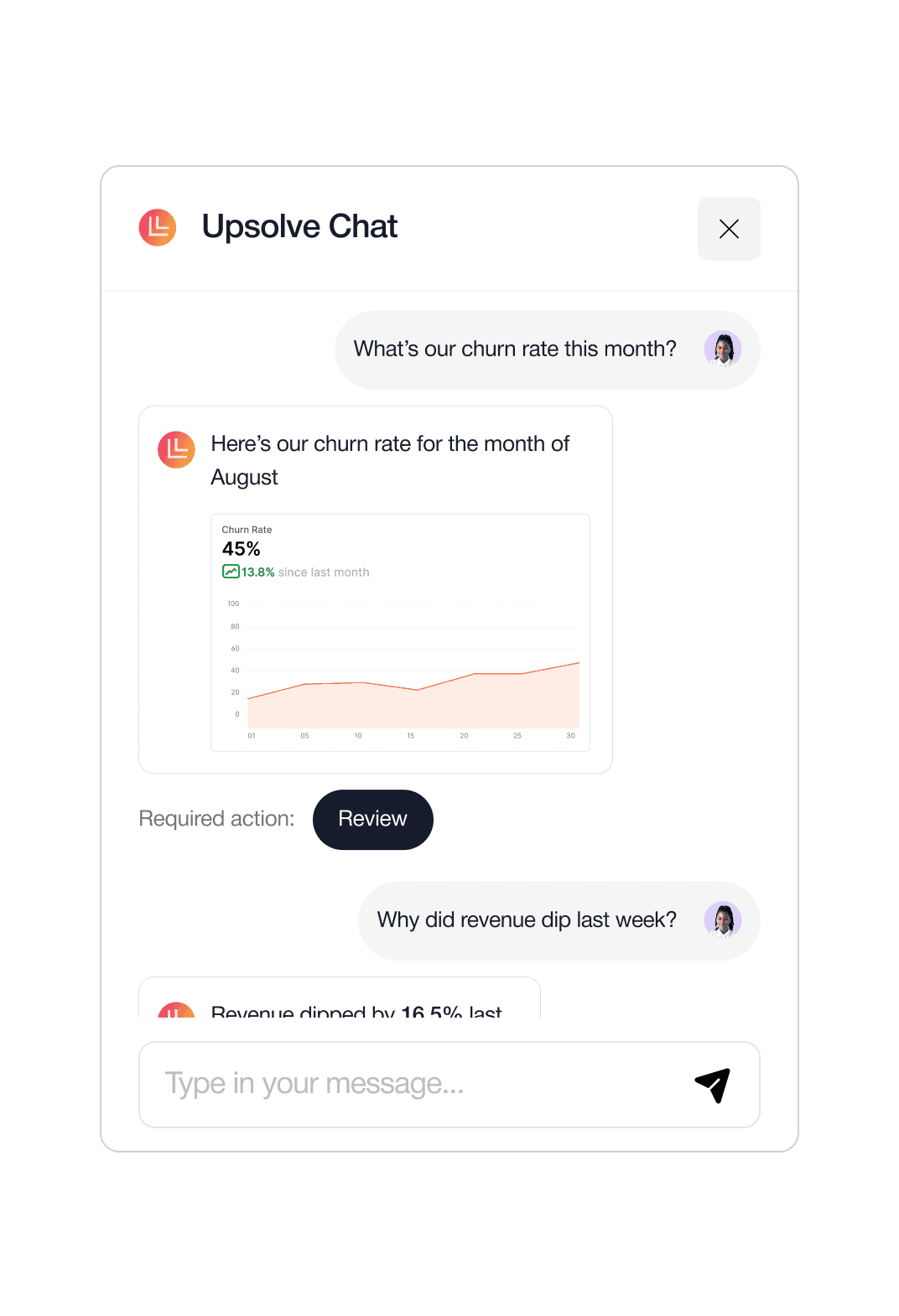 Upsolve puts a data-aware agent in front of your product to guide your customers, answer their questions in context, and help them achieve their goals faster.